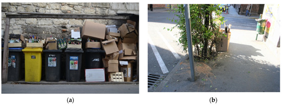 Pinke-Sziva et al. [11] conducted interviews with locals and tourists, and identified that most of the complaints arising from overtourism came from the city center of Budapest (District VII), which became a party and alcohol-centered quarter that provided an authentic visitor experience due to its ruin bars and the traces of Jewish cultural heritage. The concentration of short-term vacation rentals on Airbnb in this area is, likewise, influential in terms of leveraging the number of non-cultural tourists [78]. The touristification of the city center rapidly increased housing prices [9]. Based on data from the Hungarian Central Statistical Office (HCSO), housing prices increased 80% from 2007 to 2019 [6], which generated gentrification [9]. Other complaints about overtourism included public urination, street crime, litter, dirty streets, and the number of drunk people [11]. The photos below (Figure 3), taken in April–May 2019, demonstrate the negative environmental impacts of overtourism (cluttered streets caused by overloaded garbage containers, vomit-stained streets, and the social issue of overcrowding).