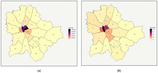 Tourism density and intensity by district: (a) tourism density by district; and (b) tourism intensity by district. Source: HCSO, calculations by authors.
