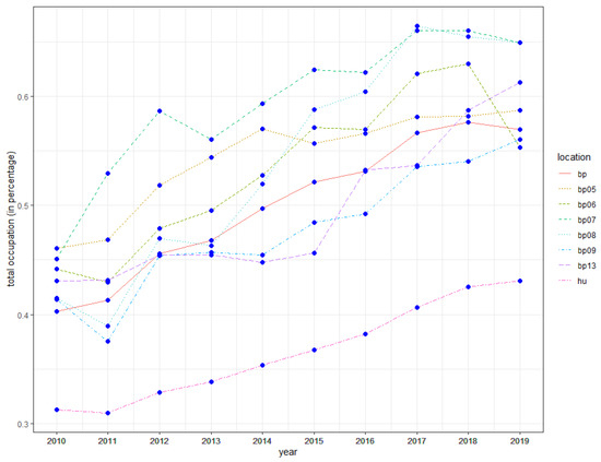 The figure displays the information at various geographical levels. At the national level, denoted as ‘hu’, the occupation rate in hotels increased by 37.7% (up from 31.3% in 2010 to 43.1% in 2019). In Budapest, denoted as ‘bp,’ the rate increased by 41.2% (from 40.3% in 2010 to 56.9% in 2019). However, at the district level the occupation rate increased unevenly. For instance, consider two districts located in the center of Budapest: in District VI, the occupation rate increased by 25.1% (from 44.2% in 2010 to 55.3% in 2019), while in District VIII the rate was 56.6% (from 41.5% in 2010 to 64.9% in 2019). Based on Figure 6, we conclude that the hotel occupation rate in Budapest displayed a robust increasing trend in the 2010s, and the rates for inner districts reached a high value by the end of the decade.