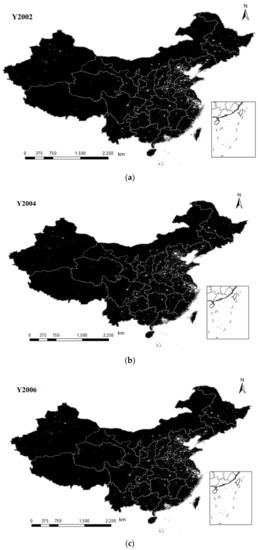 Correction of light images at night in China: (a) 2002, (b) 2004, (c) 2006.