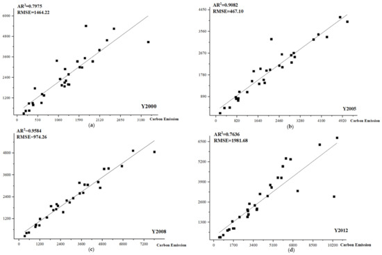 - There is a balanced and stable relationship between building carbon emissions and lighting values. After the stability test of the panel dataset of building carbon emissions and lighting brightness, the panel data of the eastern, central and western regions all passed the significance test, and they are all stable sequences of order 1 single integer, indicating that in terms of building carbon, there is a long-term balanced and stable relationship between emissions and light brightness. In addition, after the accuracy test of the constructed building carbon emissions zoning measurement model, the results of the determination coefficient AR2 between the statistical value and the simulated value and the root mean square error RMSE all passed the test, indicating that the building obtained using the panel data model. Carbon emissions and carbon emissions statistics have a good fit, and the model has good accuracy, which can be used to estimate building carbon emissions at different scales.
