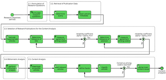 The review process consists of the following steps: In the first step, we formulate our research questions (Section 2.1). In the second step, we define the query for selecting relevant abstracts and build a database to store those abstracts as well as the corresponding publication meta-data (Section 2.2). Third, we reduced the number of publications based on their relevance and other defined selection criteria (Section 2.3). In the fourth step (Section 2.4), we derive bibliometrics for the selected publications. Finally, we perform a content analysis to derive quantitative and qualitative facts of the selected publications (Section 2.5). A detailed description of the review process is given in the following.