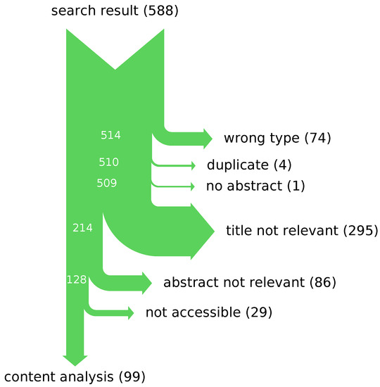 The broad meaning and inflationary use of the term “sustainability” resulted in a large number of publications that needed additional filtering to extract the relevant ones according to a set of predefined exclusion criteria. Figure 2 gives the exact numbers along this process. Following the PRISMA 2020 flow diagram [18,24], the branches wrong type, duplicate and no abstract belong to the step “Identification”. The step “Screening” is represented by the branches title not relevant, abstract not relevant, and not accessible. The “content analysis” of 99 publications represents the step “Included”.