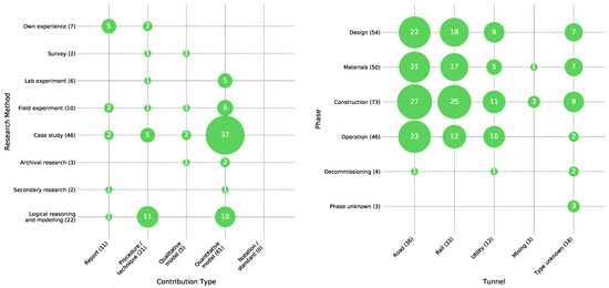 Number of publications for the facets research method and contribution type (left) and life-cycle phase and the use of a tunnel (right).