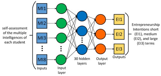 A very important aspect to clarify is that the survey was applied during the year 2020, that is, during the COVID-19 pandemic, so the responses and entrepreneurship intentions are highly related to the different digital tools used during the pandemic and also to the collaborative behavior in digital entrepreneurship. Since the technical aspects related to ANN are not within the scope of this manuscript, preference will be given to the results and findings obtained related to the main idea of the manuscript. However, important references are shared concerning the bases and applications of ANN in different areas of knowledge (AOKs) [,,]. In general, Figure 1 shows the artificial neural network diagram, where it can be seen that the input variables were the self-assessment of the multiple intelligences and the output variables were the entrepreneurial intention. The diagram also shows the input layer, the 30 hidden layers used (this parameter can be modified to improve the classifier performance), and the output layer. Other technical details of the ANN are not shown. Taking into account the aforementioned, it can be said that the use of the ANN in conjunction with an analysis of multiple intelligences to determine entrepreneurship patterns is related to the concept of artificiality. This is because an attempt was made to synthesize the reasons for entrepreneurship considering multiple intelligences in a hypothetical scenario to modify future results in the real world (sustainable real entrepreneurship actions that generate value to society) by modeling the known variables. In this case, the intention of entrepreneurship in the short, medium, and long term was shared by the students, as well as the scores of the self-evaluation related to multiple intelligences [,].