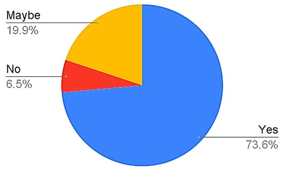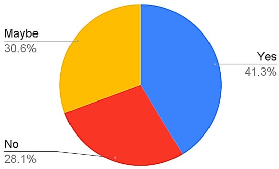 The general results of the survey are shown below. Figure 2 shows short-term entrepreneurship intentions. A total of 41.3% of the students intended to start an entrepreneurial project with a sustainable focus, i.e., an entrepreneurial project seeking a balance between the environmental, social, and economic aspects, in addition to planning a long-term project. On the other hand, 30.6% had doubts about it. Finally, 28.1% did not have an intention of entrepreneurship in the short term. In this case, the result of students who had doubts about starting a sustainable entrepreneurial project (30.6%) is interesting, because the data collection instrument also helped to determine the lack of knowledge about the concept of sustainability.