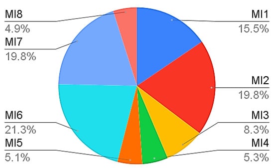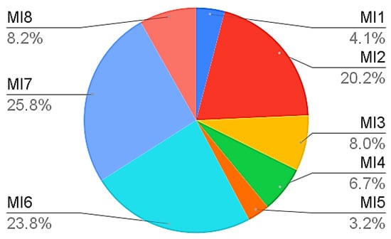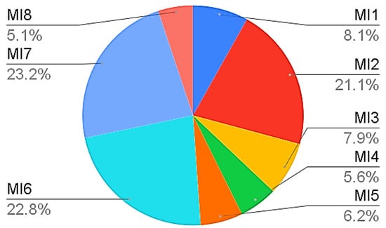 The medium-term entrepreneurship pattern was then analyzed. The results are shown in Figure 6. In this case, the intelligences most closely related to the intention of entrepreneurship were Interpersonal Intelligence (MI7), Intrapersonal Intelligence (MI6), and Linguistic–Verbal Intelligence (MI2), with 23.2%, 22.8%, and 21.1%, respectively. The least affected intelligences were Naturalistic Intelligence (MI8) and Musical Intelligence (MI4), with 5.1% and 5.6%, respectively.