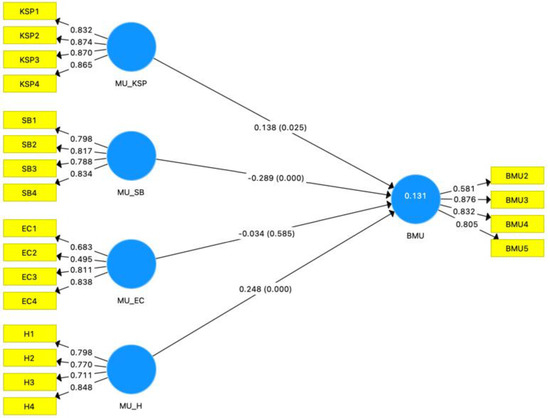 The third part of assessing the structural model was to calculate the coefficient of determination (R2) value to estimate the model’s explanatory power. Figure 2 shows the R2 value for the endogenous construct (BMU) with the substantial value = 0.131. However, according to Hair Jr, Hult, Ringle and Sarstedt [46], the greater the number of predictor constructs, the higher the R2 value. The R2 value should always be interpreted in light of the context of the study; for example, the R2 values in a model predicting human attitudes, perceptions, and intentions are doubtful. The final step was to measure the predictive relevance value using the blindfolding procedure in SmartPLS. It was found that was greater than zero for the construct (BMU) = 0.073. Through the statistics, it was shown that there was sufficient predictive relevance for the indicators of the endogenous construct in the structural model.