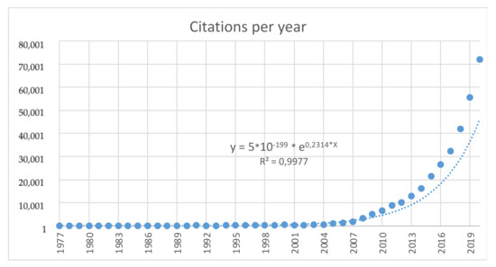 The total number of citations for Social Responsibility during this time reached 338,700, showing a similar performance as the publication of papers: it started in 1977 with two citations and increased linearly until the year 2000, when it began an exponential growth, reaching its peak in 2020 with 71,822 citations, accumulating 78.2% of citations in the last five years (see Figure 2).