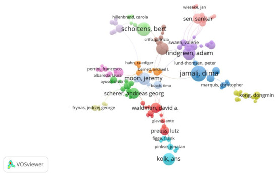 When analysing the most productive authors using VOSviewer, it emerges that, in her research, the author Garcia-Sanchez links CSR to Communications, Organisational Design, Stakeholders, Innovation, CSR practices, and Family Businesses. As for the next most productive authors with affiliation to other universities, Moon, who is the fourth most productive, relates his CSR research to Education, Gender, Codes of Conduct, Governance Systems, and Multinationals. Jamali, as the fifth most productive author, relates it to Corporate Governance, Developing Countries, Stakeholders, Investor, and People Management. This also shows the range of different fields to which CSR is linked.