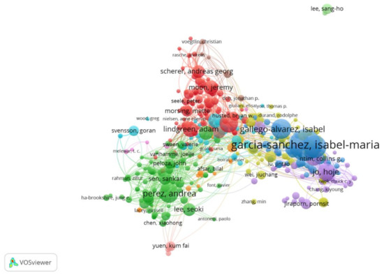 Figure 5 graph shows the six clusters. Penn State University prevails in Cluster 1 with 3497 citations and a relation with 479 other institutions; Cluster 2 is dominated by Copenhagen Business School with 4760 citations and 802 connections to other institutions; Cluster 3 by Monash University with 1902 citations and 279 connections with other institutions; Cluster 4 by Bath University with 4173 citations and a relation with 549 institutions; Cluster 5 by York University with 3506 citations and related to 575 institutions; finally, the University of Salamanca prevails in Cluster 6 with 1918 citations and is related to 357 institutions. This graph shows the large number of relationships between the most productive institutions dealing with CSR; it confirms that the production of papers is concentrated in developed countries, and that, alongside the growth, the networks between research centres are growing significantly. The authors believe that in this case any conclusions in relation to the topic under study cannot be reached, as it is limited by VOSviewer for a deeper analysis.