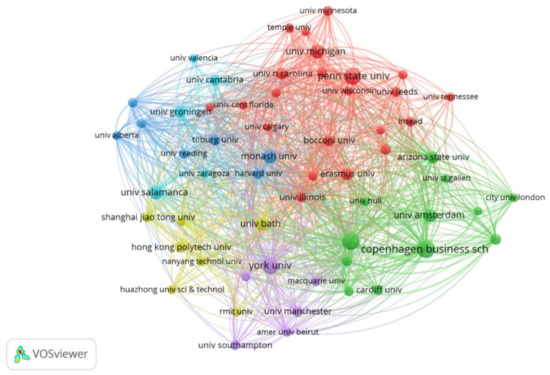 The bibliometric analysis of citations related to institutions with a minimum of 25 published papers shows 59 institutions and 6 clusters, which are detailed in Table 9. Figure 5 graph shows the correlation between the various institutions with different colours for each of the 6 clusters.