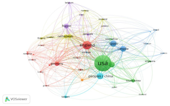 In the graph shown in Figure 6, the most predominant circumference is the USA, which belongs to Cluster 2, while England prevails in Cluster 1, and Spain, which belongs to Cluster 3, appears in third place. It should also be mentioned that the size of the circumference is proportional to the degree of co-authorships by the authors belonging to these countries.
