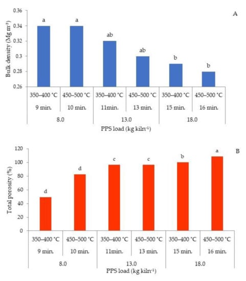 Bulk density (A) and total porosity (B) of biochar produced from PPS. Different letters above bars indicate significant differences (p < 0.05; n = 4; ANOVA; Tukey’s HSD test).