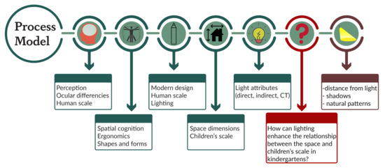 The process model depicts the main points that were reviewed from each topic in order to form the question that we investigated. From the domains of perception and ocular physiology, our main topic is the physiological difference in the eyes of a child compared to an adult resulting in differences in depth perception. Infants can only perceive visual stimuli that are relatively close to them, which leads to attention and focus on detail. Regarding spatial cognition and ergonomics, there is a larger number of movements that a child has to perform in comparison to an adult to perceive a space fully and to observe an “out-of-scale“ room.