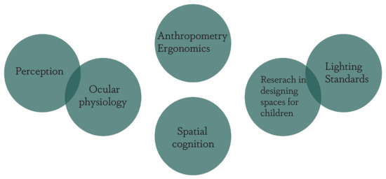 This topic was divided and structured into concepts from several contributing fields. We looked at visual perception science and how the anatomy of the human eye influences the perceptual process as well as into concepts of spatial cognition, anthropometry and ergonomics. These topics provided a foundation to inform the design of spaces that support cognitive processes of the users, focusing on the role of light and lighting. We also reviewed the existing lighting standards and guidelines and consulted the current research in the field of lighting and educational spaces. The described theoretical foundation of this study is depicted in Figure 1.