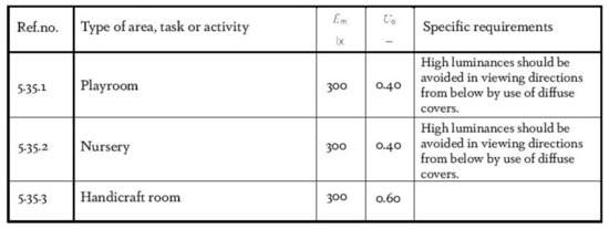 Lighting design is a vital aspect in designing educational spaces, and specific requirements need to be met. The amount of light needed varies depending on the type of space and its intended function. Generally, in educational spaces and classrooms, the amount of light needed has a great variety due to the numerous different course activities that take place throughout the day. Specifically, lighting standards as shown in Figure 3, the requirements in kindergartens are set by the EN 12464-1:2011 lighting standards [34].