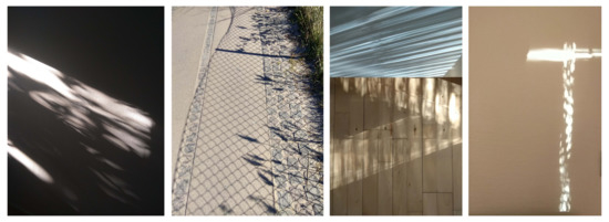 Light and shadow patterns can sometimes also be linked with specific hours of the day. The last two photos (Figure 6) of light patterns only appear during the morning (due to the direction of the morning sun) and therefore suggest information regarding time.