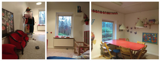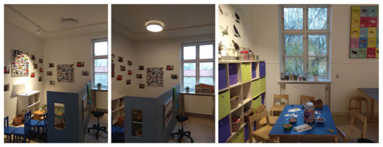 The observations made in the two kindergartens suggested the need for more options in terms of light control and different light scenarios. At the same time, the observations confirmed the importance of windows and daylight in the space as stated in Section 4.6.1 and Section 4.6 [28,32]. The observation that children prefer playing closer to the windows highlights how essential it is to provide the opportunity for a connection with the exterior environment [31] (see also Table 2).