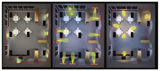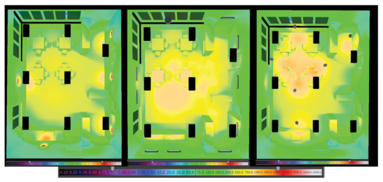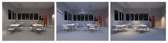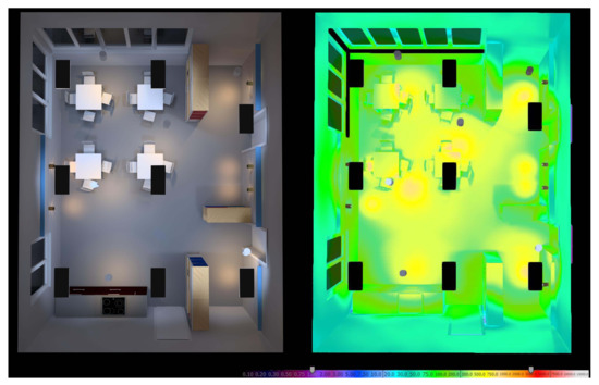 The achieved illuminance levels from the combined light sources were following the standards, according to which the illuminance must be above 300 lux. As shown in Figure 16, there were areas of higher concentration of light due to the use of directional lights. Although the light levels were higher as indicated, there was the choice of dimming both the ceiling lights and spotlights, creating different scenarios according to the users’ needs and preferences.