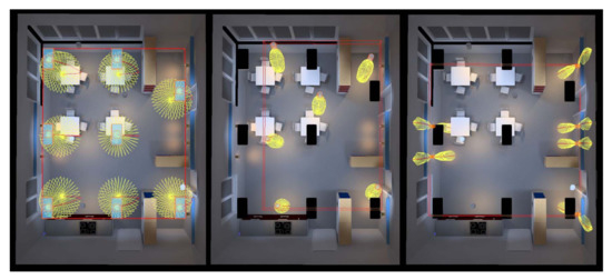 The field of view is smaller, suggesting that a visual stimuli that could be distracting or annoying due to movement for adults might not be for children [44,45]. The projected pattern will be only visible during specific hours of the day and can act as an indicator of time linked to the seasons or daily schedule. If artificially produced, the pattern could, for example, appear in space before specific activities, such as lunchtime, acting as a recognisable signal for the children. An example of the projected pattern can be seen in Figure 18.