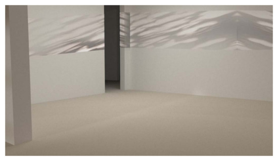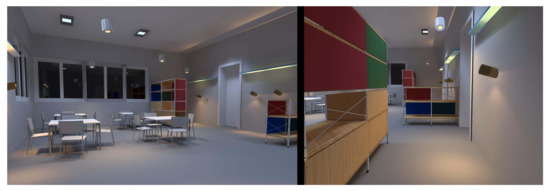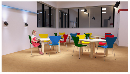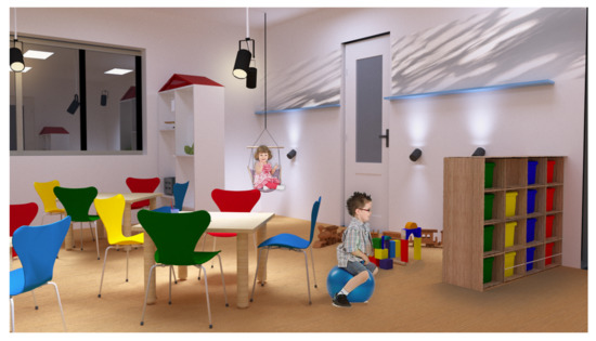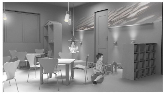 The simulation of the space illustrates the three proposed light layers in combination with a projected pattern. The proposed strategy shown in Figure 19 and Figure 20 uses the placement of the spotlights and wall lights at a height of 1.70 m, based on children’s vantage points. The use of spotlights creates sharp shadows of the illuminated objects in space and provides useful visible contrast to define different areas using light.