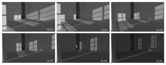The daylight study focused on the shadows created in the space during September. The illustrations shown in Figure 17 the movement of shadows from 13:00 to 15:30. After 15:30, the sun was hidden behind the surrounding buildings, and the sunlight was not visible in the interior space. The projection of the light pattern should be consistent with the daylight distribution and where the daylight falls in the space.