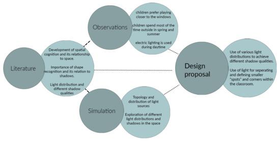 The simulations acted as a tool for choosing a combination of light fixtures and layouts and for evaluating the different distributions and the resulting shadow qualities. The use of both directional and diffused light for the creation of a perceptually lower ceiling using lighting, and the use of contrast to distinguish different activity areas are aimed at catering better to children’s perceptual needs. The projected pattern is proposed as a link to the exterior environment with the potential of acting as an indicator for time and specific activities. The overall approach of the paper is summarised in Figure 22.