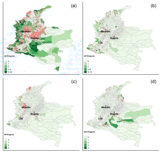 Project locations across Colombia. (a) All projects, (b) conflict prevention (CP) projects, (c) projects focused on women (W), (d) German-funded projects with gender as significant objective (GG); red dots indicate project locations; green shading reflects the number of projects for each municipality; maps are oriented so that the top faces north.