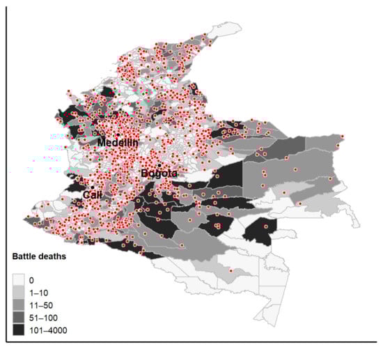 We employed data from the UCDP Georeferenced Event Dataset. The UCDP data contains point locations for events of organized violence including the number of battle deaths. We located conflicts within municipalities and computed the total count of battle deaths over the period 1994–2004 (see Figure 2). This period can be considered a time of high-intensity conflict in Colombia. After 2004, the number of battle deaths declined considerably, marking the beginning of the post-conflict period around 2006–2007 [47]. Large numbers of battle deaths were recorded, particularly in municipalities southeast of Bogota.