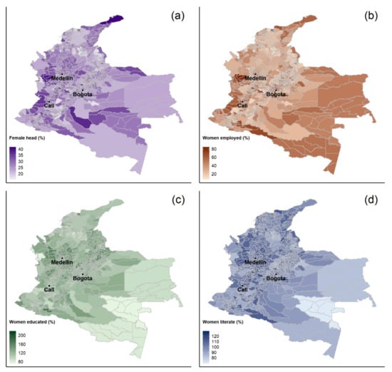 As the first indicator, we computed the percentage of female versus male household heads for a given municipality to capture vulnerable populations. Depending on the local context, female-headed households can be more vulnerable than male-headed households [84]. Colombia, for example, has witnessed a feminization of poverty in the past decades [85], especially in conflict-affected departments [86]. Female-headed households also often face multiple discriminations and are more vulnerable during times of conflict and in the post-conflict phase [87,88]. In Colombia, the proportion of female-headed households among IDPs, for example, was higher than the national average indicated by the census data [89].