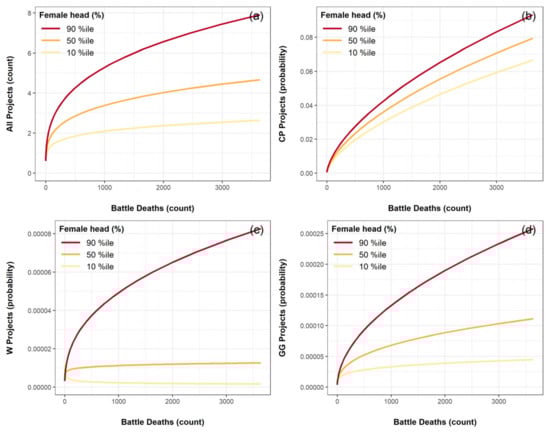 Visual representation of the interaction between battle deaths and the percentage of female heads by project type ((a) = All Projects; (b) = CP Projects; (c) = W Projects; (d) = GG Projects); predictions were generated for the average value of all other variables in the model; all projects: Negative binomial models; conflict prevention (CP) projects, projects focused on women (W), and German-funded projects with gender as significant objective (GG): Logit models; CP and W projects started implementing during the years 2006–2013; GG projects started implementing during the years 2012–2018; conflict data for years 1994–2004; 10% ile = 21% female household heads, 50% ile = 26% female household heads, 90% ile = 31% female household heads.