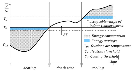 Figure 1 shows the reduction of energy consumption schematically. An exemplary outdoor temperature curve shows the three possible phases in which heating, cooling or neither heating nor cooling is required (death zone). The thresholds and limit the range of acceptable indoor temperatures. The energy consumption, which is determined as the integral of the temperature difference between indoor temperature and the respective threshold over time is given in gray. The blue-colored area indicates the potential energy saving through changes of the correlated color temperature. The amount of savings is ultimately determined by the magnitude of the effect on temperature perception. If the indoor temperature in buildings were reduced by 1.0 °C, energy consumption would be reduced by around 6% according to DIN V 4108-6/DIN V 4701-10 for climatic conditions similar to Germany [39,40]. Therefore, the use of appropriate lighting systems bears great potential to leverage further efficiency potential in the building sector. With advanced heating, ventilation, and air conditioning (HVAC), and color-dimmable lighting systems, indoor environmental parameters can be precisely adjusted. Since light color changes do not substantially increase energy consumption, the energy savings can be fully realized [10].