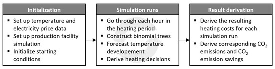 The simulation starts at 00:00 on October 1 and sequentially runs through all individual hours in the heating period for an hourly granularity. We have the current outside temperature and electricity price available for each hour. As mentioned in Section 1 and Section 2.2, we use binomial trees as the foundation for the ROA approach to model heating deferral as a deferral option. To this end, we set up the binomial tree by first deriving the periodical log-returns in the electricity data following Equation (1). So that Equation (1) can also be applied in the case of negative electricity prices, we temporarily shift the electricity prices upwards and later correct for this shift in the final analysis. Assuming risk-neutrality, we follow [30] and derive the development factors and respective probabilities required for the binomial tree as in Equations (2)–(4). We exclude the time because it always equals one hour and let the risk-free interest rate equal zero because interest rates are negligibly low for one-hour periods. For further details, we refer to the literature.