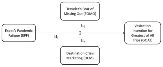Similarly, destination crisis marketing can mobilize travelers towards vaxication intention while they find ways to overcome their pandemic fatigue [4,11]. Destination crisis marketing refers to a set of communications aligned with the travelers’ unwavering expectations about destinations (e.g., authenticity, transparency, empathy, humility, creativity, and optimism) during a crisis (e.g., COVID-19 pandemic) [11]. By enduring crisis marketing strategies, tourism destinations can generate high appeal among travelers for their first trip after vaccination [11,22]. Alternatively, ignorance of destination crisis marketing can impose a lack of destination visibility and preparedness for hosting a safe tourism experience [23]. Consequently, travelers in search of vaxication for the greatest of all trips (i.e., first mega trip after vaccination) are inclined to cancel their plans for a destination that seems insensitive and/or irresponsible in dealing with the pandemic crisis. The travel presence and perspectives of international expatriates play an influential role in the development and restoration of global tourism. The international expats’ community serves as a critical foundation in reframing destinations as worldwide centers of tourism attractiveness [24,25]. Moreover, expats are regarded as trustworthy information hubs, as they become vital collaborators in destination marketing initiatives across the globe [4,26]. The significance of international expats’ is particularly heightened in developing nations, which are frequently exposed to socio-political unrest and violent conflicts [27,28]. Given the growing importance of expats in branding nations as safe, popular, and attractive destinations for tourism [4,26], the present study aimed to unfold the effect of expats’ pandemic fatigue on their vaxication intention for the greatest of all trips (GOAT), under the moderating influence of travel FOMO and destination crisis marketing.