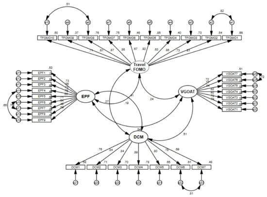 The conceptual model of this study included a total of four latent constructs, namely expat’s pandemic fatigue (independent variable), vaxication intention for greatest of all trips “GOAT” (dependent variable), travel fear of missing out “FOMO” (moderating variable), and destination crisis marketing (moderating variable), respectively. To measure these latent constructs, two scales were carefully developed (i.e., travel FOMO and DCM), while two scales were selectively adapted (i.e., expat’s pandemic fatigue and vaxication intention for GOAT). Importantly, the psychometric scale properties were well established after review and constructive feedback taken from senior academics (n = 5) and tourism industry practitioners (n = 4). The “expat’s pandemic fatigue” was measured with the help of a 9-item construct adapted from Zaman et al. [4], which inquired the expats about the level of tiredness and fatigue as a result of COVID-19 restrictions and bans, their constant dread of contagion, and the detrimental psychological impact of COVID-19 media and social conversations. The items were coded as EPF1-EPF9 and were set on a 5-point Likert scale where 1 represented strong disagreement and 5 indicated strong agreement. Similarly, vaxication intention for GOAT was measured using an adapted scale (including 7 items coded as VGOAT1-VGOAT7) from Zaman et al. [4] as well as guidance from prominent literature [9,37,56]. A 10-item construct was developed to measure Travel FOMO [15,16,20]. The items were designed on a 5-point Likert scale and were coded as TFOMO1-TFOMO10. Lastly, the destination crisis marketing construct (including 7-items coded as DCM1-DCM7) was also developed after an extensive literature review and guidance from seminal research on crisis communication, crisis marketing, destination crisis management, and tourism crisis communication, respectively [57,58,59,60,61,62,63,64,65,66,67,68].