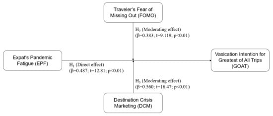 In the final step of the analysis, the path coefficients (with t-statistics) were assessed to test the hypothesized relationships, as the data normality, goodness of fit indices, convergent and discriminant validities, and non-existent multicollinearity were well established. The structural model assessment included conventional statistics (beta-coefficients, t-statistics, and p-values), as reported in previous studies [4,9,74,77]. The outcomes of t-stats, p-values, and path coefficient tests are summarized in Table 6 and graphically presented in Figure 3. The positive values of inter-construct correlations (reported in Table 5) confirm the positive association between expat’s pandemic fatigue and vaxication intention for GOAT. Moreover, the positive value of the path coefficient (β = 0.487) reinforces this evidence. The higher values of t-stats (t = 12.81) and lesser p-value (p < 0.01) confirmed the statistically significant and positive influence of expat’s pandemic fatigue on vaxication intention for GOAT. Consequently, hypothesis 1 (H1) is accepted. In contrast, hypothesis 2 (H2), which tested the moderating influence of travel FOMO (on the relationship between expat’s pandemic fatigue and vaxication intention for GOAT), is also accepted due to the positive and statistically significant interaction (β = 0.383, t = 9.119, and p < 0.01). Likewise, hypothesis 3 which theorized the moderating influence of destination crisis marketing on the relationship between expat’s pandemic fatigue and vaxication intention for GOAT is also accepted on similar grounds (β = 0.560, t = 16.47, and p < 0.01). In summary, all the three hypotheses offered in the conceptual model are accepted based on empirical evidence. This implies that the pandemic fatigue in expats fosters their intentions to go on vacations (after receiving mandatory vaccination shots), whereas their fear of missing out on travel opportunities and the effective destination crisis marketing campaigns can significantly reinforce their vaxication intention.