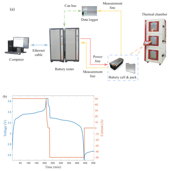 Aging test design for battery: (a) platform for aging experiment of battery; (b) complete cycle charge and discharge curves.