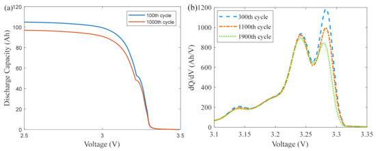 Figure 3a represents the Q-V discharge curve of the battery under two different aging cycles (100th cycle and 1000th cycle), with the increasing number of cycles releasing the same amount of electricity at a decreasing voltage value. Firstly, a constant discharge voltage interval is selected, and the discharge voltage fragment Vseg is shown in Equation (1):