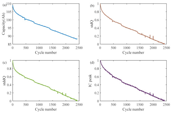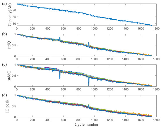 Figure 5 shows the decay curves of the pack capacity and three HIs of the fifteen cells. Figure 5a shows the decay curves of the pack capacity; after the abnormal data are eliminated, the remaining capacity shows a linear monotonic decreasing trend with slight local fluctuations. In Figure 5b,c, the decay curves of stdQ and stddQ are shown, respectively. There are two apparent fluctuations and opposite directions in two cluster decay curves, indicating that anomalies occurred in two regions during the aging experiments. Figure 5d shows that IC_peak has the same aging characteristics as the capacity decay curve. Although there are two fluctuations in the same direction as the fluctuations in Figure 5b, the changes are minor.