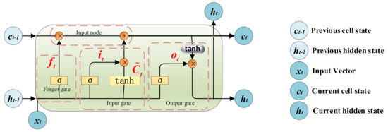 where σ and tanh are the sigmoid and hyperbolic activation functions, respectively, w and b are different weight matrices and bias matrices, respectively. Ct−1 and Ct are the previous moment cell state and current cell state, respectively, and Ct is the updated cell state. ht−1 and ht, are the previous hidden state and the current hidden state. Ct−1, ht−1, and xt are the inputs of LSTM, while Ct and ht are the outputs.