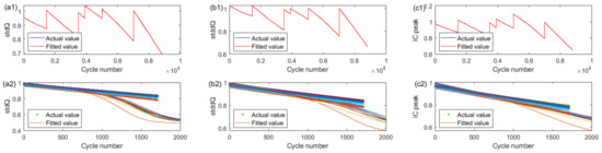 For the LSTM degradation model under the same operating condition, the three sets of the HI decay curves corresponding to Cell #4 with the fitted curves are shown in Figure 10(a1,b1,c1) (before correction), where the blue line is the actual value and the red line is the predicted value of the LSTM degradation model. Figure 10(a2,b2,c2) shows the decay curves of the three HIs corresponding to the battery pack with the predicted values (after correction). Due to the gradual accumulation of errors in the recursive rolling process of the LSTM model, although the deviation of the predicted values from the actual values is slight for the first 900 cycles, the errors increase rapidly from the 901st cycle to the 1742nd cycle as the cycles continue to accumulate. Then, the LSTM degradation model experiences the error accumulation effect under the same operating condition, and the error is too large to correct at the later stage. The MAE and RMSE between the actual values and the predicted values for the LSTM degradation model of the battery pack under the same operating condition are 0.0523, 0.0401, 0.11 and 0.1624, 0.1933, 0.0939, respectively. The results show that the local aging characteristics of the pack HIs are in good agreement with the predicted values, indicating that the LSTM degradation model can capture the ageing characteristic of local HIs. Nevertheless, the ability to capture the aging characteristic of global HIs is relatively poor due to the disadvantages of cumulative errors.