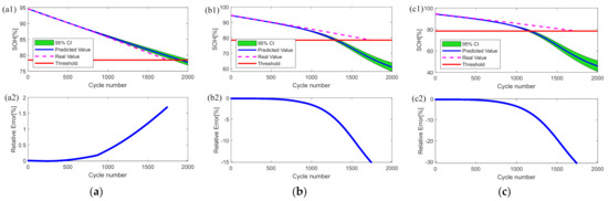 Under the same operating condition, the battery pack cycle life early 10% HIs and capacity are used as the training set of the battery pack capacity estimation model. On the basis of the EXP degradation model, the LSTM degradation model, and the fusion degradation model, used to predict the future HIs of the battery pack, the predicted battery pack state of health is analyzed against the actual value to calculate the error. Figure 15 shows the corresponding battery pack state of health prediction results under the three groups of models: the HI exponential degradation model-GPR capacity prediction model (EXP-GPR), the HI exponential degradation model–HI LSTM degradation model–GPR capacity prediction model (EXP-LSTM-GPR), and the HI LSTM degradation model–GPR capacity prediction model (LSTM-GPR). Figure 15(a1,b1,c1) shows the prediction error of the battery pack for each of the three cases. The solid red line indicates the battery state of the health cutoff threshold. The red dotted line is the actual value, the solid blue line is the estimated value, and the green shaded area is the 95% confidence interval used to describe the uncertainty of the prediction result. Figure 15(a2,b2,c2) shows the relative errors under the three groups of models EXP-GPR, EXP-LSTM-GPR, and LSTM-GPR, respectively. Among them, Figure 15(a2) shows that the relative error corresponding to the first 406 cycles is negative, while the relative error from the 407th cycle to the 850th cycle is positive and exponentially increasing. Then, the error increases rapidly from the 851st cycle to the 1742nd cycle, and the maximum relative error is only 1.7%. Figure 15(b2) indicates that the relative errors of the fusion model are all negative when the weights of the single degradation model are 0.5. The relative error is less than −0.4% for the first 600 cycles, and the relative error shows exponential growth from the 601st cycle to the 1200th cycle. The error increases linearly and rapidly from the 1201st cycle, with the maximum relative error reaching −15%. Comparing Figure 15c with Figure 15b, the result shows that the two relative errors have the same trend, but the maximum relative error of the latter is about twice as large as that of the former.