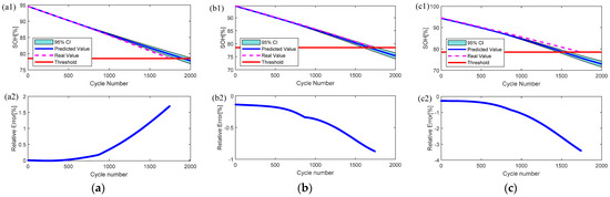 Battery pack SOH prediction results and relative error (same operating condition). (a) EXP-GPR prediction model: (a1) SOH prediction results; (a2) relative error. (b) EXP-LSTM-GPR prediction model: (b1) SOH prediction results; (b2) relative error. (c) EXP-LSTM-GPR prediction model: (c1) SOH prediction results; (c2) relative error.