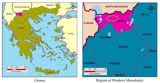 The region of Western Macedonia is located in the northwestern part of Greece and includes four regional units (Florina, Grevena, Kastoria and Kozani). The regional unit of Florina is located on the borders of three countries (North Macedonia, Albania and Greece) and the capital of this regional unit is the city of Florina (Figure 1). The distance between the city of Florina and Athens (capital of Greece) is 571 km, and Florina is 170 km from Thessaloniki (second largest in Greece). Due to its border location, Florina is a gateway to the Western Balkan countries and a regional transport center. According to the last census of 2011, the population of Florina Regional Unit is 51,414 inhabitants and it covers an area of 1927 km2 [62,63].