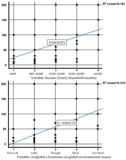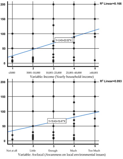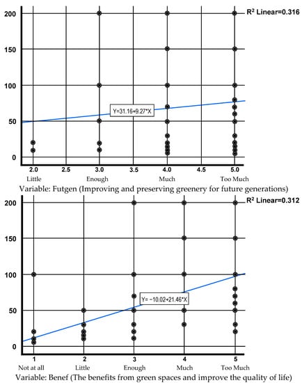 In this analysis, with the help of logistic and linear regression, the variables of the questionnaire are used to investigate the willingness of people to pay or not for all the necessary actions for the improvement and maintenance of the urban and suburban green of a city [62]. These variables may be some of the demographic or socioeconomic characteristics of the respondents or other characteristics, such as their perceptions and beliefs about various questionnaire responses, as well as their preferences for other questions.