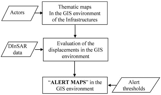 Our proposal aims to achieve organizational improvements in road infrastructure safety planning with the support of the DInsAR data following the path shown in Figure 1. By employing the deformation time series derived from DInSAR data, in our case related to the Italian COSMOSkyMed satellite constellation, alert maps are defined in the GIS environment as instruments to promote the optimal coordination between the various actors (Figure 1).