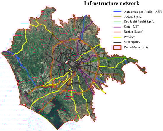 The proposed approach was applied to the area covering the municipality of Rome (Italy). The site under investigation is not always flat and some natural hazards (e.g., floods and landslides) characterize the geographical area. The road map in the analysis (implemented in the GIS environment and obtained from “openstreetmap”) includes about 1600 km of road infrastructures classified as highways, primary and secondary roads, with different agencies responsible for their safety management.