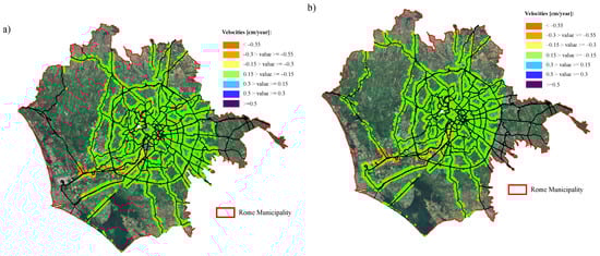 In this way, the average velocity (in time and in space) value was calculated for each covered cell in accordance with Peduto et al. [38]. Then, combining both the ascending and descending data, the V and H velocities and, consequentially, displacements were determined. Finally, these values were matched with the alert thresholds (Table 1) to construct the alert maps plotted, respectively, in Figure 5a,b.