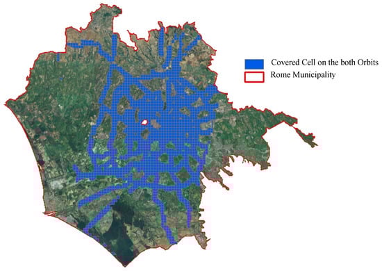 The next stage consisted of the division of the road infrastructures into regular cells measuring 50 × 50 m, as proposed by Calvello et al. [47]. Each cell was designated “covered” if at least one measurement point (with measurements associated to a 3 m × 3 m square) was within its perimeter, also taking account of localization error [38]. The cells covered by the two orbits (i.e., ascending and descending) amounted to about 2000 cells, as shown in Figure 4.
